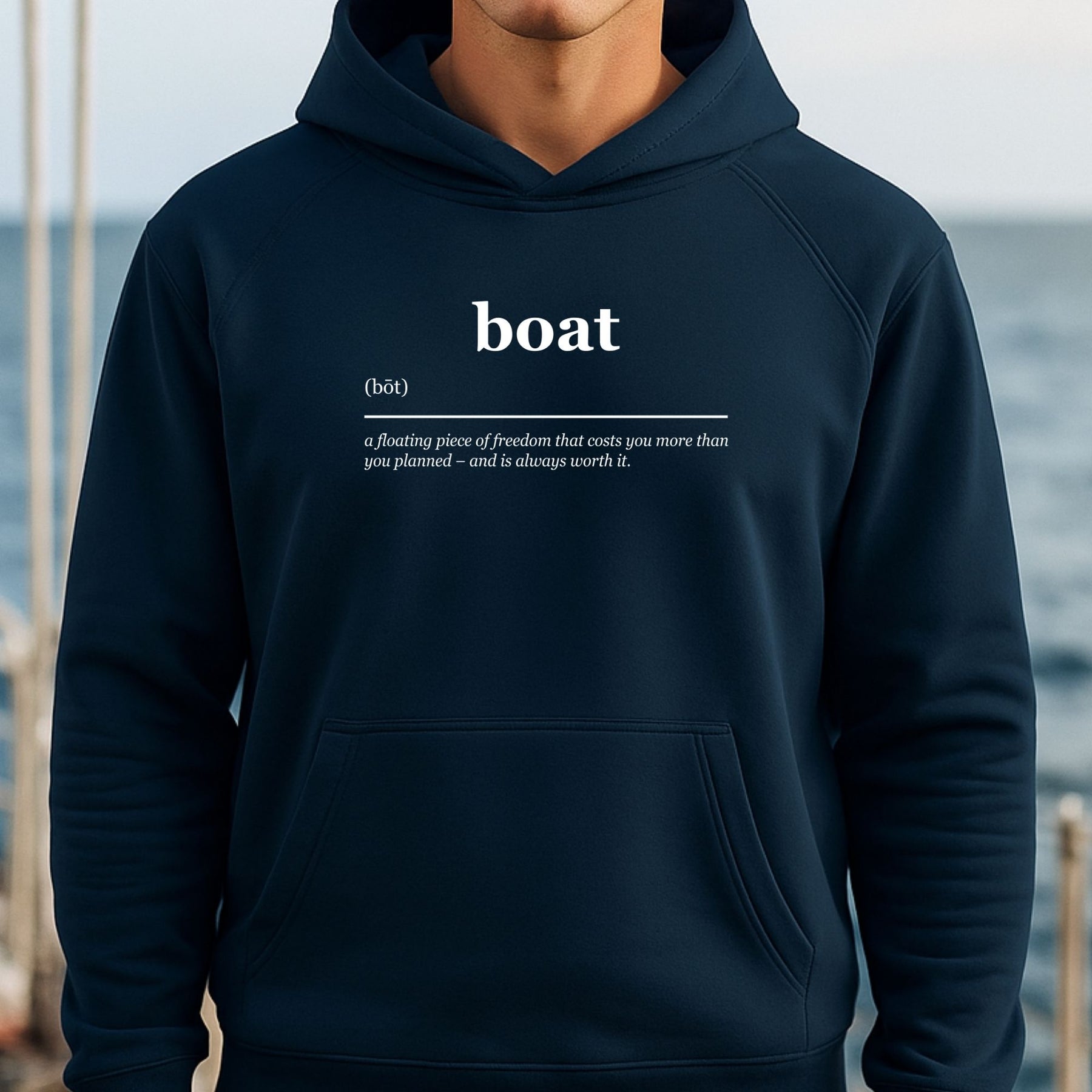 A boat isn’t just about getting from A to B. It’s about sunsets on the water, wind in your hair, and that priceless feeling of escape. Yes, it costs more than you thought – but every moment out there makes it worth it. This hoodie captures that truth with style and humor.