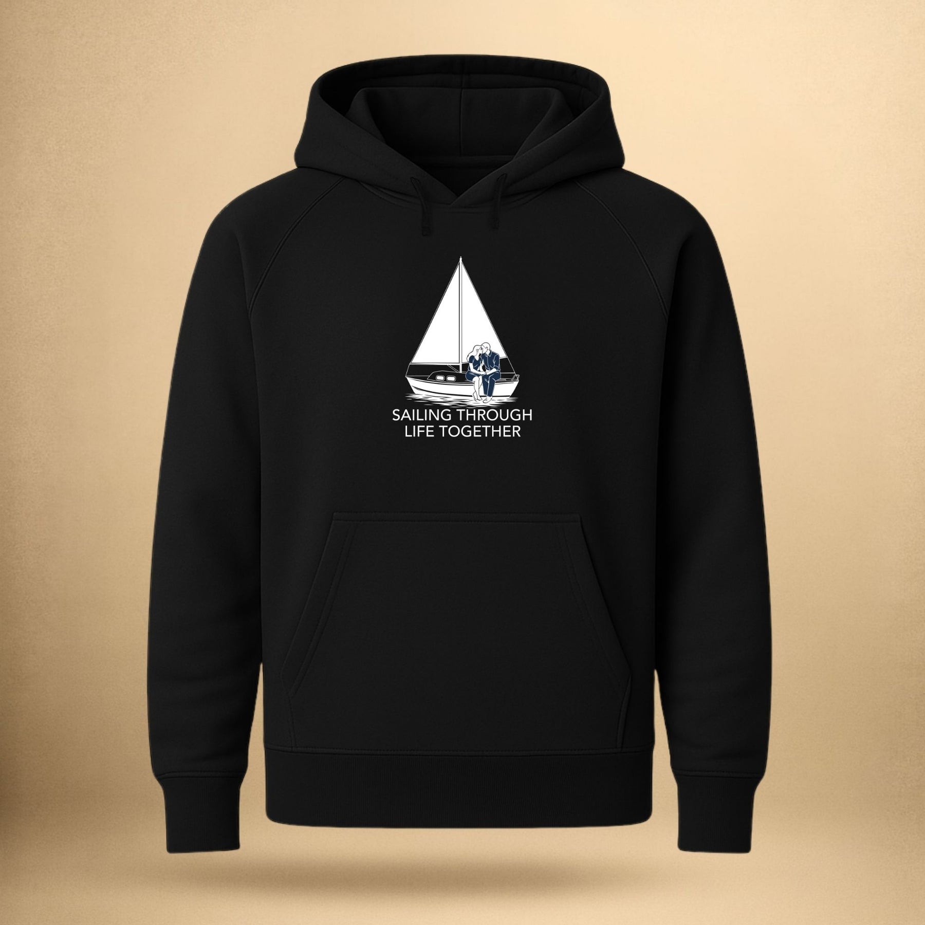 Der Hoodie „Gemeinsam durchs Leben segeln“ ist für Wärme, Bedeutung und Stil gefertigt. Hergestellt aus schwerer Bio-Baumwolle mit Raglanärmeln, bietet er Komfort und trägt eine zeitlose maritime Botschaft.